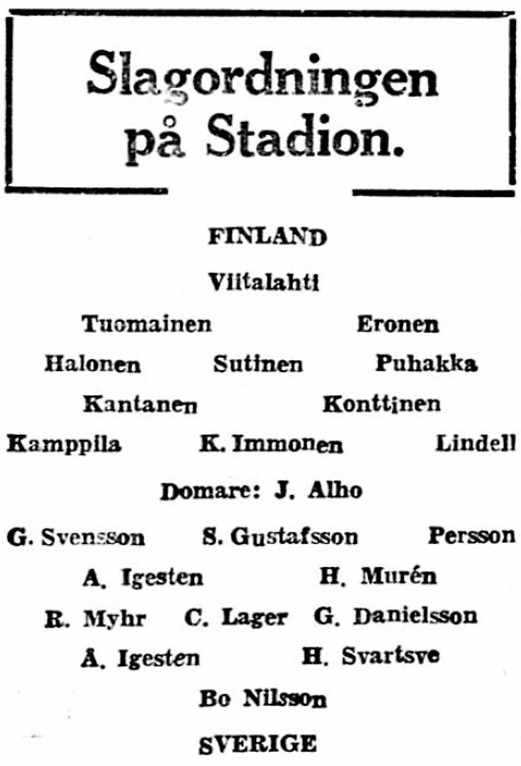 11 февраля 1940 года. Стокгольм. Олимпийский стадион. Товарищеский матч. Швеция - Финляндия - 2:1 (газета «Хювюдстадсбладет» от 14 февраля 1940 года)