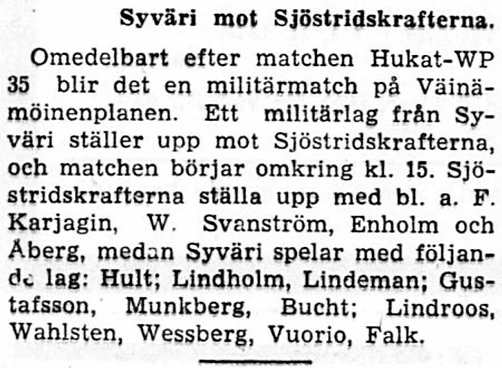 «Завтра военный футбол. Завтра в 7 часов вечера мы снова будем играть в футбол. Встречаются команда Военно-морской базы и немецкое военно-морское подразделение, которое некоторое время назад разгромило команду из Хельсинки со счетом 4:0. На прошлой неделе Военно-морская база одержал победу над еще одной немецкой командой со счетом 6:1. Ожидается, что поединок в среду будет равным. Немецкая команда в том числе сыграла и в Таллине вничью с Эстонией. В обеих командах играют известные игроки. В составе Военно-морской базы играют Лассе Саксберг, Фраде Карягин, Эрик Оберг, Вальтер Сванстрём, Сотиола и Ненонен. Лучшими немецкими игроками являются центральный полузащитник Янсен из «Шальке-04» и правый полузащитник Мюллер-III из «Дрездена». Все немецкие игроки довольно молоды, Янсен в свои 24 года - самый старший» (газета «Хювюдстадсбладет» за 25 июля 1944 года).