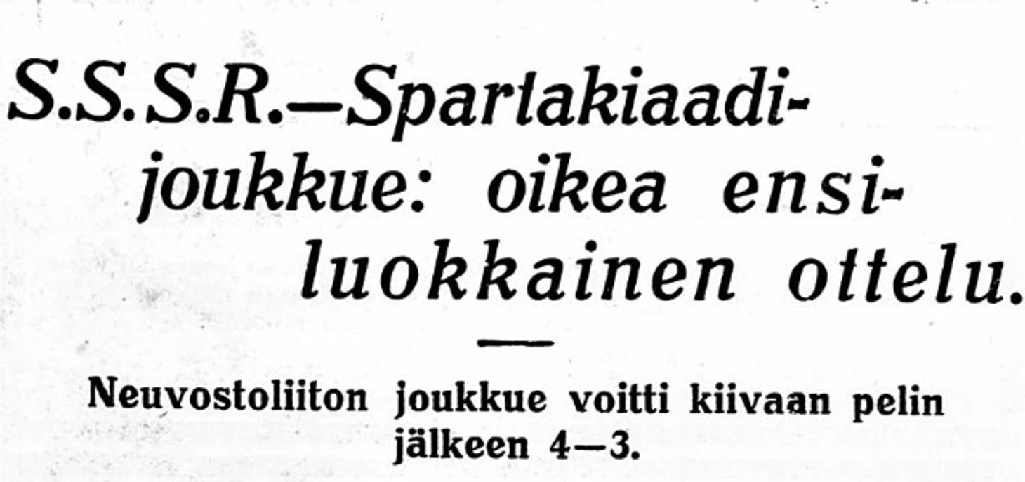 Заголовок репортажа из газеты «Тюёвяеньярьестёен тиедонантая» от 22 октября 1928 года «СССР - сборная команды Спартакиады: настоящий первоклассный матч. Советская команда выиграла напряженную игру со счетом 4:3»