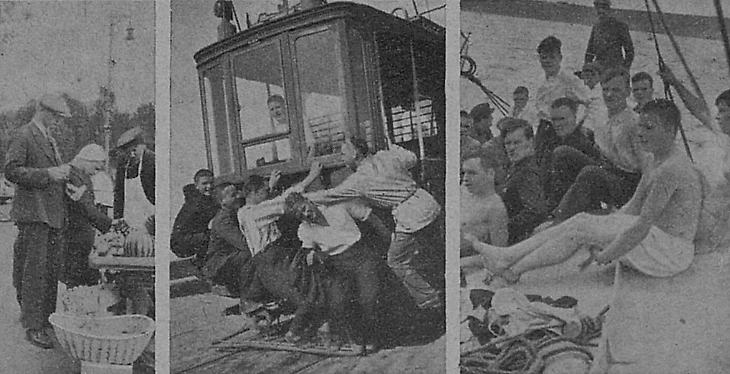 Сентябрь 1928 года. Турне сборной Финляндии TUL по СССР. Игрок финской сборной В. Фёрстен покупает арбузы в Николаеве (фото слева). Гости веселятся в Харькове при поездке на трамвае (снимок в центре). Прогулка по Черному морю на яхте (фото справа) / журнал «Тюёвяен урхейлулехти» № 48-49 от 7 декабря 1928 года