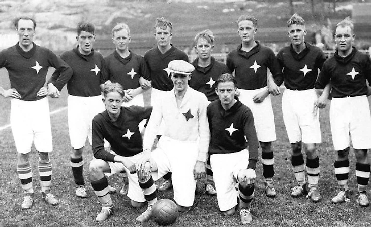 18 марта 1928 года. Хельсинки. Стадион «Тюёвяен Луйстинрада». Сборная Финляндии TUL - сборная металлистов Ленинграда - 7:0 (3:0). Фото победителей (газета «Суомен сосиалидемокраатти» от 19 марта 1928 года)
