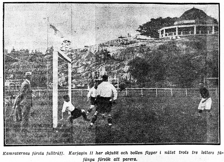 «Сегодня в 17 часов состоится международный корпоративный матч между командами стокгольмского Ab. Gasaccumulator* и дочернего предприятия этой компании в Хельсинки. В стокгольмской команде много опытных игроков, включая нескольких, игравших во втором дивизионе. В команде Хельсинки играют «старая печка» (gamla uven) Фраде Карягин и Окерберг из ХИФКа» (газета «Хювюдстадсбладет» за 20 августа 1946 года).
