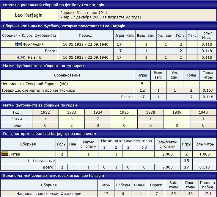Финская «Википедия»: «Лео Карягин / Leo Karjagin (31 октября 1911 - 17 декабря 2003) - финский футболист, завершивший игровую карьеру после сезона 1943/44 годов. Полузащитник. Его братья* - Франс Карягин и Александр Карягин также были футболистами. На протяжении всей своей карьеры** играл за ХИФК (133 игры - 14 голов). Чемпион Финляндии в 1930, 1931, 1933 и 1937 годах. За период с 1932 по 1943 год провел 17 матчей за национальную сборную. Так же играл в хоккей с мячом. И за сборную, и за ХИФК, с которым выиграл пять чемпионатов. В национальной хоккейной команде - четыре матча, а также шесть за вторую».
