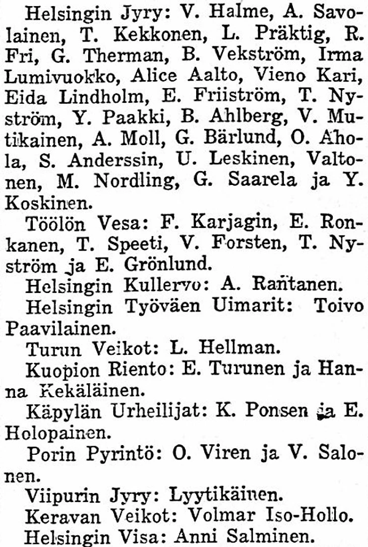 2 сентября 1928 года. Список финских спортсменов, принимавших участие в московской Спартакиаде и исключенных за это из TUL (газета «Тюёвяеньярьестёен тиедонантая» от 8 сентября 1928 года)