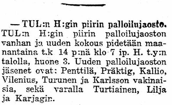 Информация из газеты «Тюёвяеньярьестёен тиедонантая» от 12 февраля 1927 года о предстоящей встрече футбольного секции хельсинкского подразделения TUL. Франс Карягин числится среди запасных