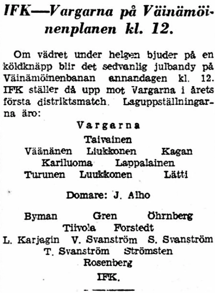26 декабря 1944 года. Хельсинки. Стадион «Тёлён Паллокенття». Поле «Вяйнямёйнен». Традиционый рождественский матч. ХИФК - «Судет». Ориентировочные составы команд. «ХИФК - «Волки» в 12 часов на поле «Вяйнямёйнен». Если погода в выходные будет прохладной, то во второй день Рождества в 12 часов на поле «Вяйнямёйнен» состоится традиционый рождественский хоккейный матч. Следующий раз ХИФК с с «Виипурин судет» (Хельсинки) встретится в первом туре регионального чемпионата» (газета «Хювюдстадсбладет» за 24 декабря 1944 года)