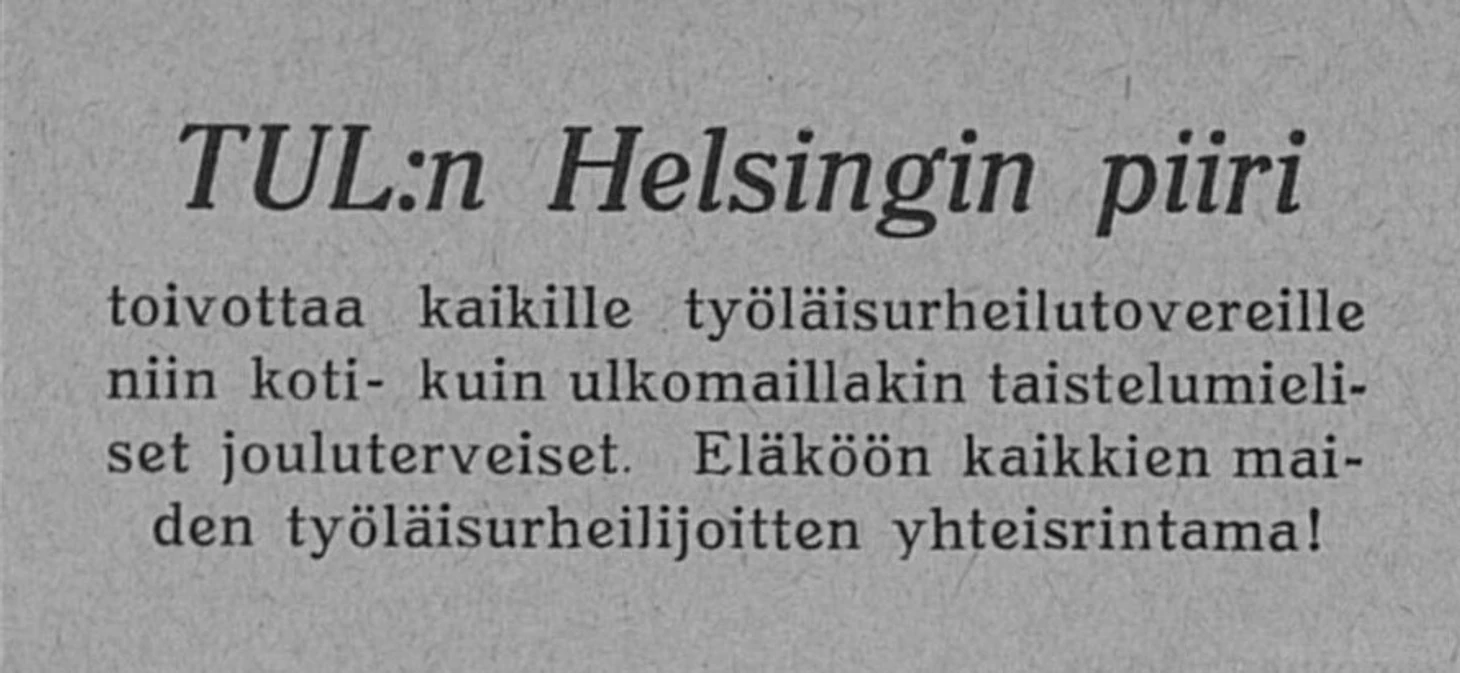 «Хельсинское отделение TUL поздравляет всех своих спортивных друзей из рабочего класса, как дома, так и за рубежом, с боевым Рождеством. Да здравствует единый фронт спортсменов рабочего класса всех стран!» (еженедельник «Тюёвяен урхейлулехти» № 48-49 от 7 декабря 1928 года)