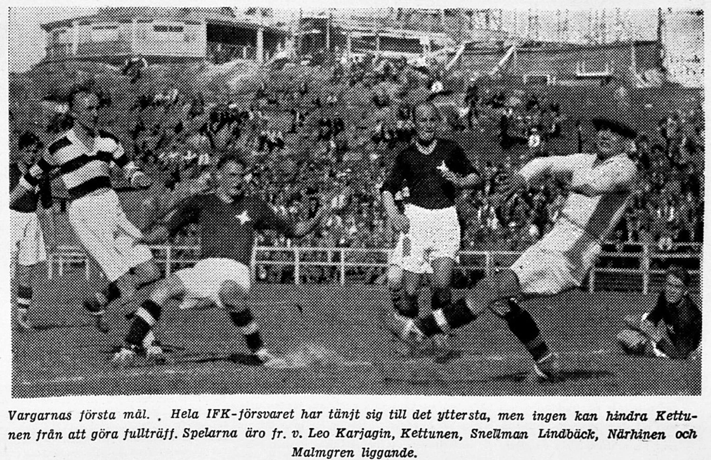 29 августа 1940 года. Хельсинки. Олимпийский стадион. Товарищеский матч. Финляндия - Швеция - 2:3 (1:2). 13-я минута. «Кнут Йоханссон выводит Швецию вперед со счетом 1:0. [Ф.] Карягин (слева), Хейнонен (справа)» (газета «Хювюдстадсбладет» от 30 августа 1940 года)