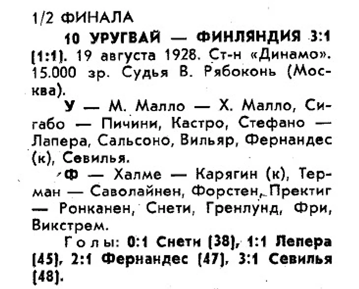 19 августа 1928 года. Спартакиада КСИ. Первенство сборных союзных республик.1/2 финала. Уругвай - Финляндия - 3:1(Шваб П.Г. «Энциклопедия советского футбола», Черновцы, 1994 год)