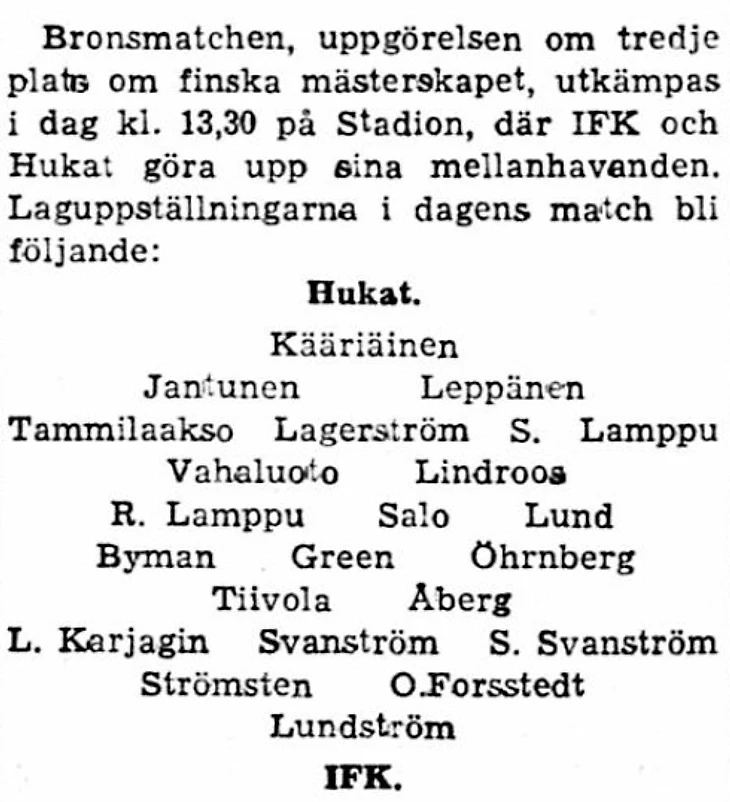 25 февраля 1945 года. Хельсинки. Олимпийский стадион. Чемпионат SPL по хоккею с мячом. Матч за 3-е место. ХИФК - «Хукат» (Хельсинки) - 6:5 ОТ (1:2). Ориентировочные составы команд (газета «Хювюдстадсбладет» за 25 февраля 1945 года)