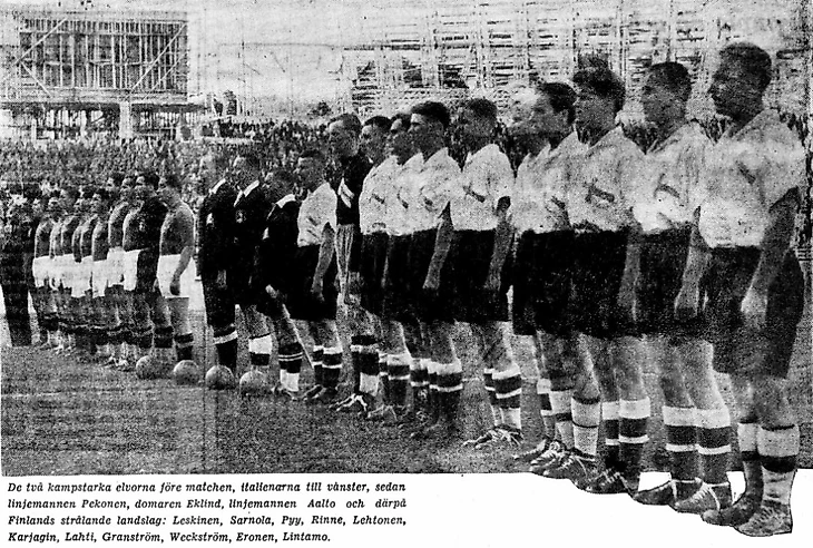 20 июля 1939 года. Хельсинки. Олимпийский стадион. Товарищеский матч. Финляндия - Италия - 2:3 (2:2). Франс Карягин - пятый справа (газета «Хювюдстадсбладет» от 21 июля 1939 года)