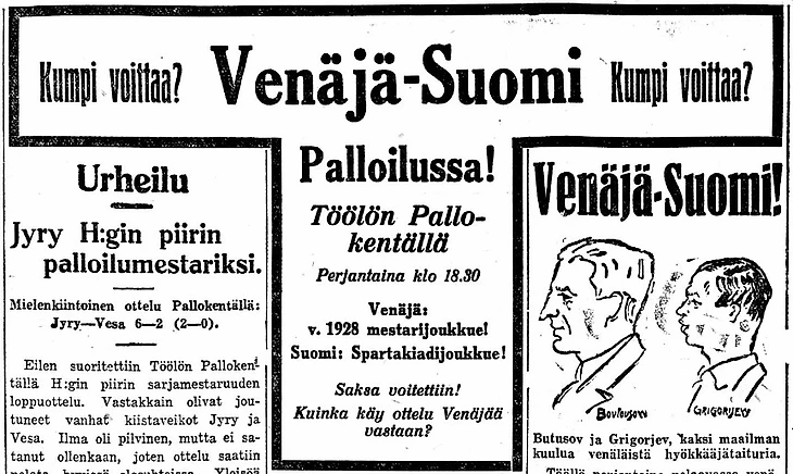 Анонс из газеты «Тюёвяеньярьестёен тиедонантая» за 9 августа 1928 года: «Кто победит? Россия - Финляндия. Футбол! Стадион «Тёёлён Паллокенття». Пятница в 18:30. Россия: сборная чемпионов 1928 года! Финляндия: спартакиадная команда! Германия потерпела поражение! Как пройдет матч против России?». Рядом с афишей, рисованные изображения Михаила Бутусова и Петра «Капуля» Григорьева - «двух самых известных в мире русских нападающих»