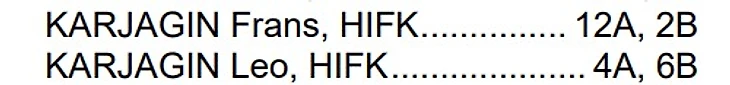 «В классе-2 ХИФК-2 играл против KUV-I. ХИФК выиграл со счетом 5:3 (3:0). Голы у победителей забили: Франс Карягин - 2, Форстедт - 1, Ангер - 1 и Хемминг - 1» (газета «Хювюдстадсбладет» за 10 января 1945 года).