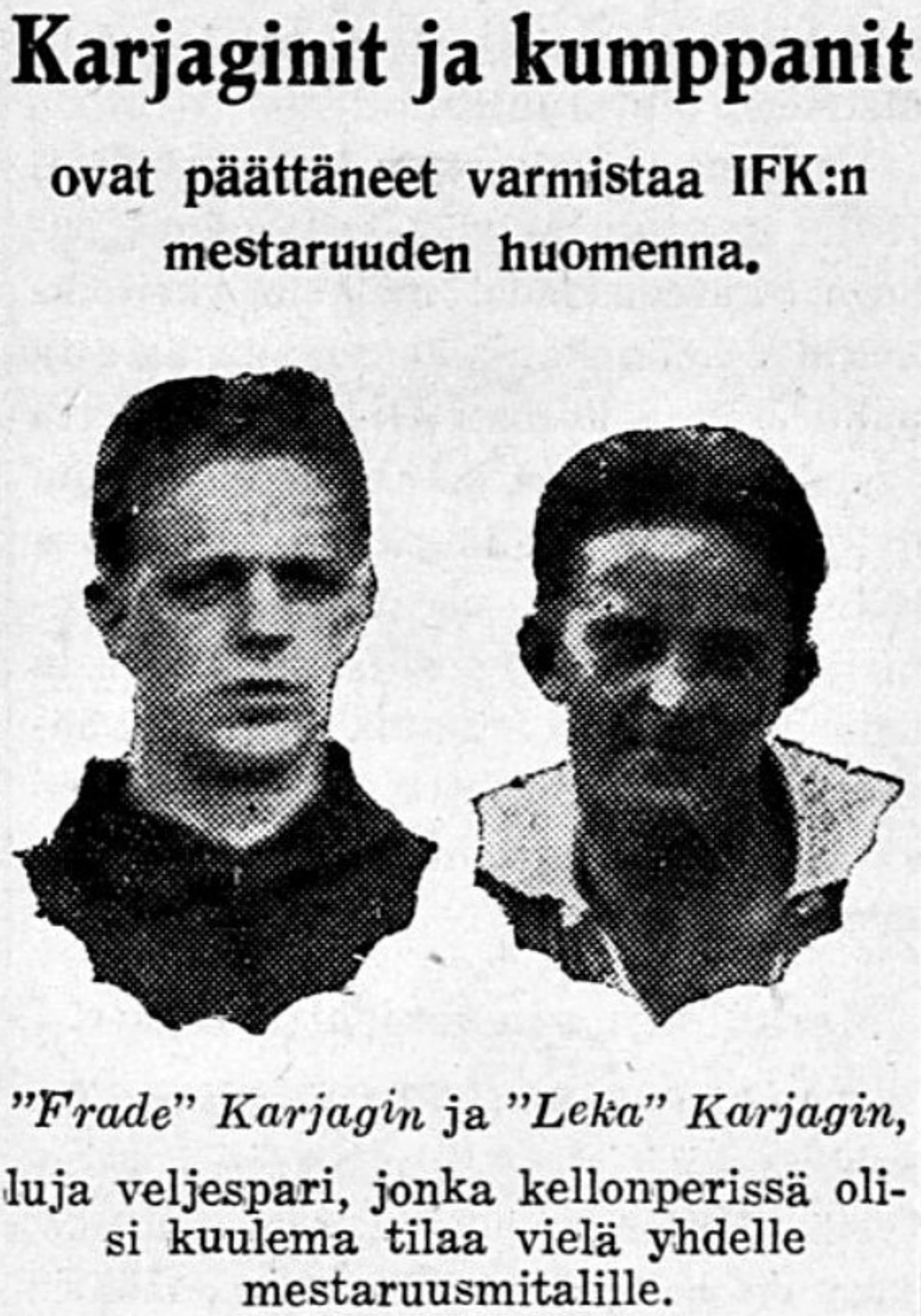 10 октября 1943 года. Хельсинки. Олимпийский стадион. Чемпионат SPL по футболу 1943/44. ХИФК (Хельсинки) - ВИФК (Вааса) 1:1. Одноклубники из Хельсинки и Ваасы после игры. Франс Карягин - первый справа во втором ряду. Лео Карягин - шестой справа во втором ряду (газета «Хювюдстадсбладет» за 11 октября 1943 года)