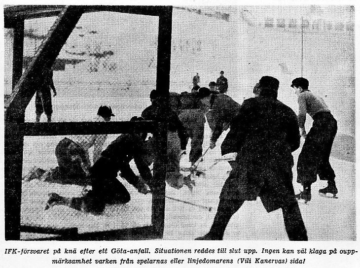 13 февраля 1927 года. Стадион «Тюёвяен Луйстинрада» / «Рабочий каток». Финал чемпионата TUL по хоккею с мячом. «Куллерво» (Хельсинки) - «Веса» (Хельсинки) - 4:7; основное время игры - 4:4 (2:2). «Опасный момент у ворот «Веса» (газета «Суомен сосиалидемокраатти» от 14 февраля 1928 года)