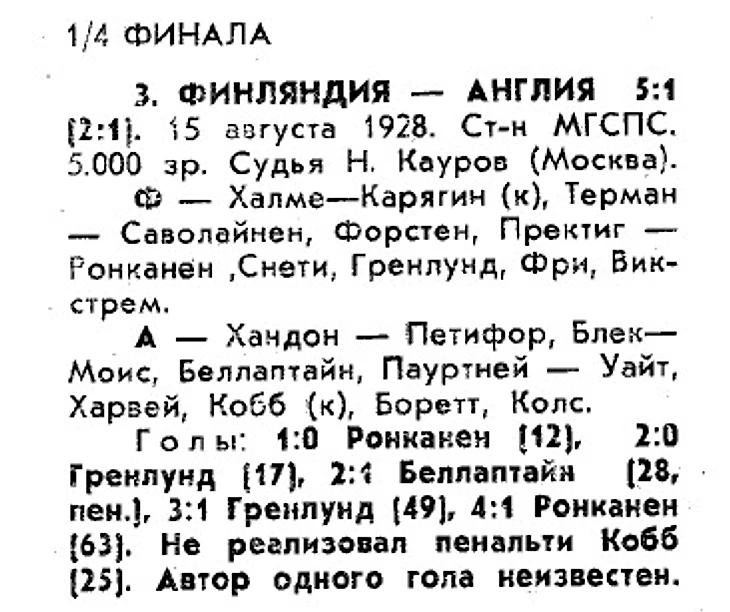 21 октября 1928 года. Хельсинки. Сборная Финляндии (спартакиадная) / Spartakiaadijoukkue - сборная Москвы - 3:4. Судья матча, составы команд и их расстановка на поле, а также запасные финнов из газеты «Тюёвяеньярьестёен тиедонантая» от 20 октября 1928 года. Хозяева планировали выставить точно такой же состав, что и на игру 10 августа со сборной Ленинграда (2:4), изменения были только по занимаемым позициям (но, судя по газетным отчетам участие в матче принял участие Векстрём). Нашу команду газета называет сборной России - Venäjä (Веняйя). Ее предварительный состав она дала, видимо, по двум предыдущим встречам в Хельсинки. По факту он был иным. Например, капитан московской команды - динамовец Константин Блинков - вместо центрфорварда играл левого защитника. Кстати, в наших справочниках можно встретить информацию, что сборная Москвы 21 октября 1928 года играла со сборной профсоюза металлистов Финляндии, тоже конфликтовавшего в то время с TUL
