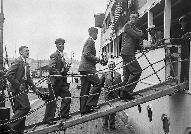 21 февраля 1942 года. Хельсинки. Аэропорт Малми. «В субботу основная часть сборной по хоккею с мячом отправилась самолетом в Стокгольм на матч национальных команд. Настроение было прекрасным, даже несмотря на предматчевые расклады, которые не в пользу Финляндии. На изображении игроки у аэробуса перед вылетом (слева направо): Франс Карягин, Х. Бюман, В. Сванстрём, Линдрос, Торстен «Щукен» Сванстрём, С. Сало, А. Лагерстрём, «Аскен» Оберг, П. Конттинен и руководитель П. Линдхольм» (газета «Хювюдстадсбладет» за 22 февраля 1942 года)
