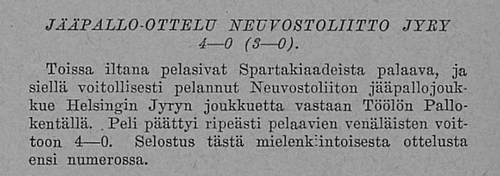 «Матч по хоккею с мячом: Советский Союз - «Юрю» - 4:0 (3:0). На днях советская хоккейная команда, победоносно сыгравшая на Спартакиаде, возвращаясь домой сыграла на стадионе «Тёёлён паллокенття» против команды «Юрю» (Хельсинки). Встреча закончилась победой быстро игравших россиян со счетом 4:0» (журнал «Тюёвяен урхейлулехти» № 10 от 8 марта 1928 года).