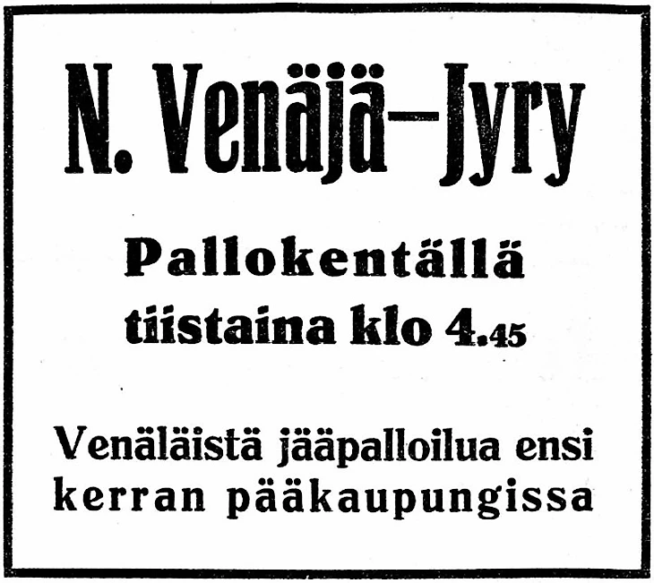 5 марта 1928 года. Объявление в газете «Тюёвяеньярьестёен тиедонантая»: «C.[оветская] Россия - «Юрю». «Паллокенття», вторник, 4:45 после полудня. Российский хоккей с мячом впервые в столице»