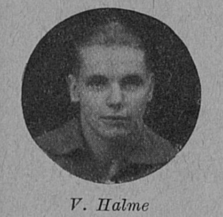 левый полузащитник - Вильо Халме (Viljo Halme), 21 год, слесарь, игрок сборных Рабочего спортивного союза Финляндии (Suomen Työväen Urheiluliitto /TUL) по хоккею с мячом и футболу (в футболе - вратарь); за команды «Юрю» играет пять лет [капитан сборной Финляндии TUL по футболу на Спартакиаде 1928 года в Москве; за период с 1932 по 1939 год сыграл 30 матчей за сборную Финляндии SPL по футболу; считается одним из лучших вратарей Финляндии за всю историю финского футбола; также играл в хоккей с шайбой - чемпион 1932 года в составе ХИКа]
