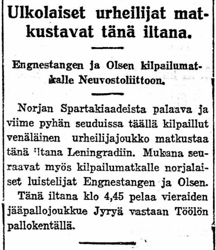 «Иностранные спортсмены уезжают сегодня вечером. <...> Российские спортсмены, возвращающиеся с норвежской Спартакиады, проводят заключительные соревнования и отправляются в Ленинград. <...> Сегодня вечером в 4:45 команда гостей сыграет с «Юрю» в хоккею с мячом на стадионе «Тёёлён Паллокенття» (газета «Тюёвяеньярьестёен тиедонантая» за 6 марта 1928 года)