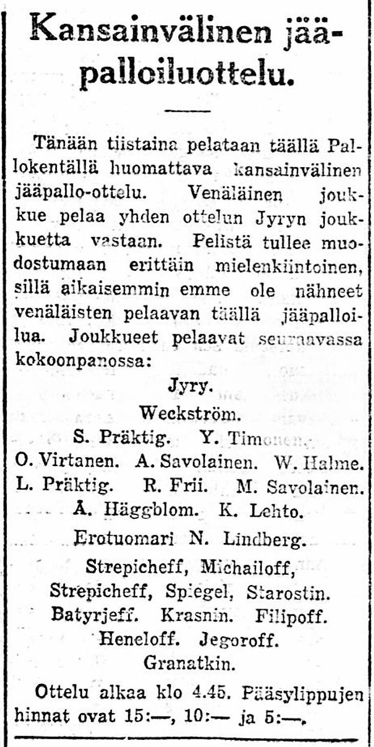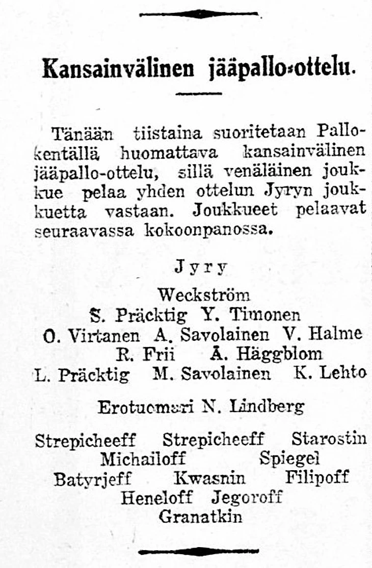 «Международный матч по хоккею с мячом. Сегодня, во вторник, на «Паллокенття» состоится знаменательный международный хоккейный матч, ведь сборная России играет один матч с командой «Юрю». Команды играют в следующих составах: