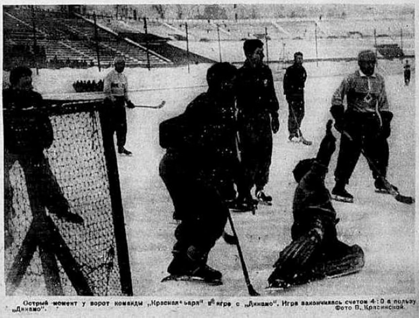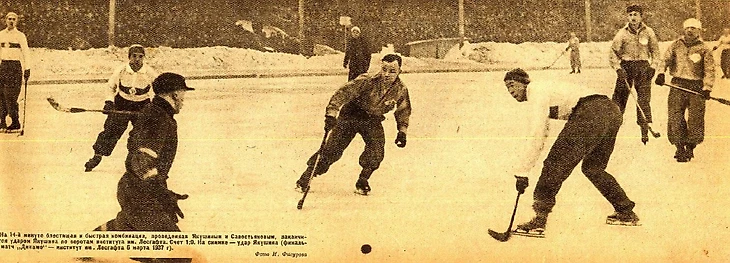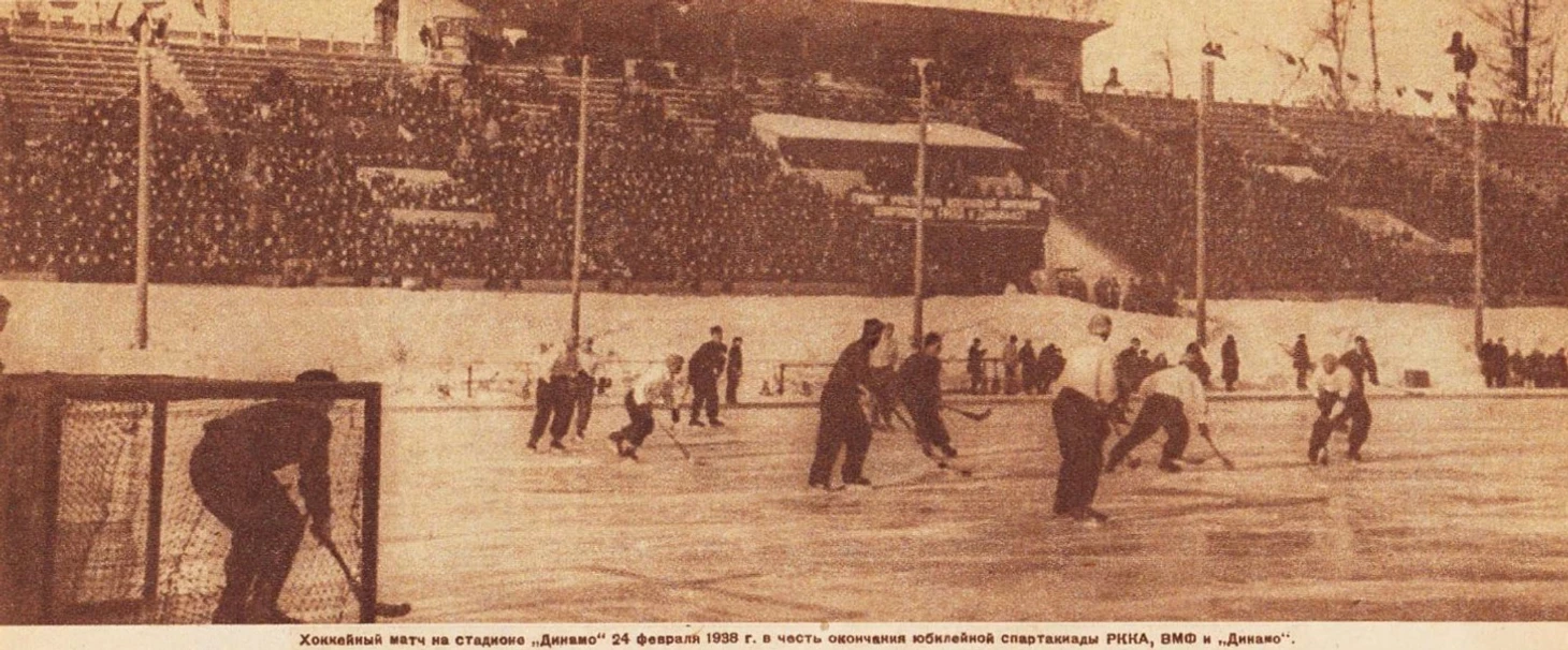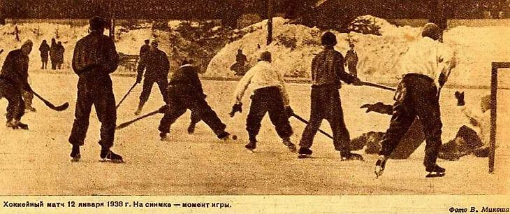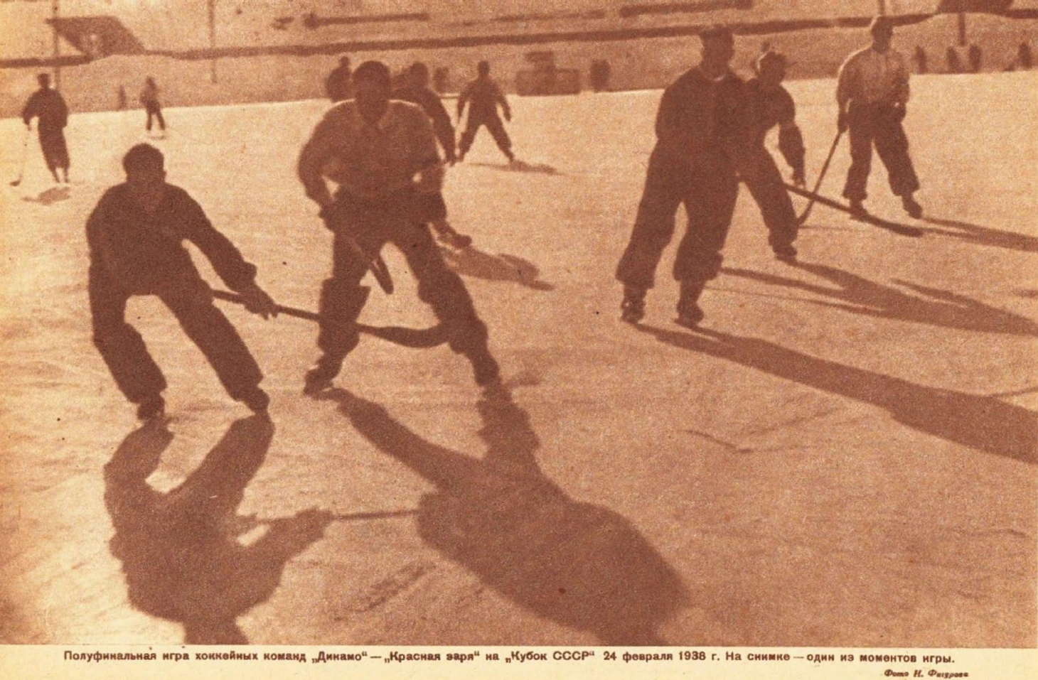 6 марта 1938 года. Москва. Стадион «Динамо». Спортивный праздник, посвященный окончанию розыгрыша Кубка СССР по хоккею. Москва - Ленинград - 2:1 (фото Фетисова и Яблоновского из газеты «Вечерняя Москва» за 8 марта 1938 года)