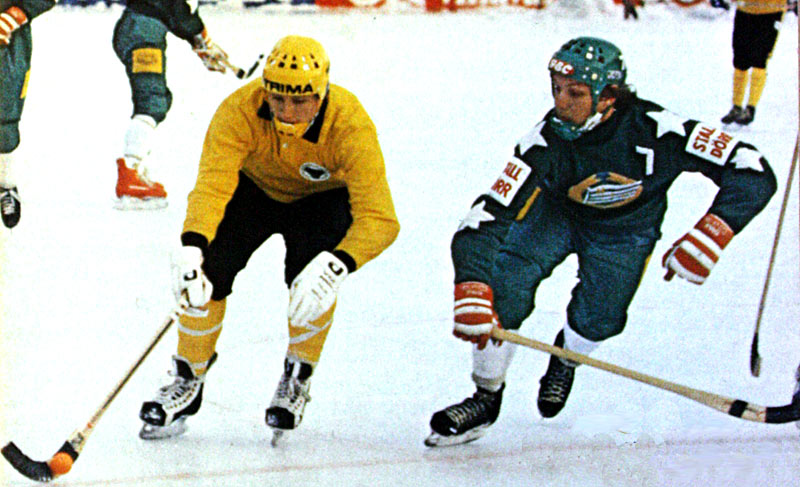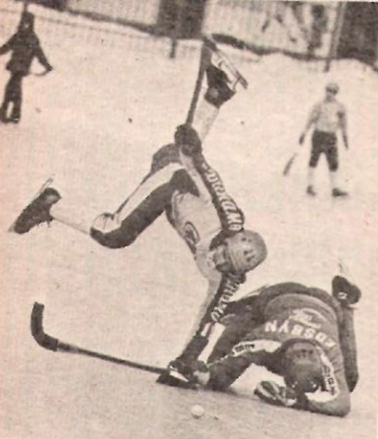 Первая половина 1970-х. Чемпионат Швеции. Лидер «Фалу» Бернт «Бемпа» Эрикссон (№ 8) против Хокана Сундина из «Бруберга» (bandyfeber.com)