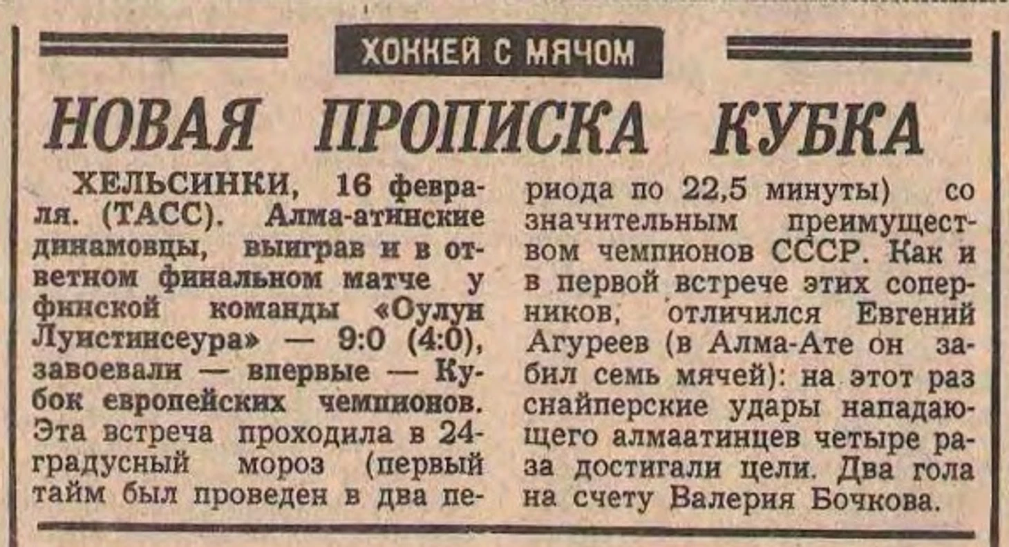 16 февраля 1978 года. Оулу. Кубок европейских чемпионов 1977/78. Финал. Ответная игра. «Оулун Луистинсеура» (Оулу) - «Динамо» (Алма-Ата) - 0:9 (газета «Советский спорт» № 40 за 17 февраля 1978 года)