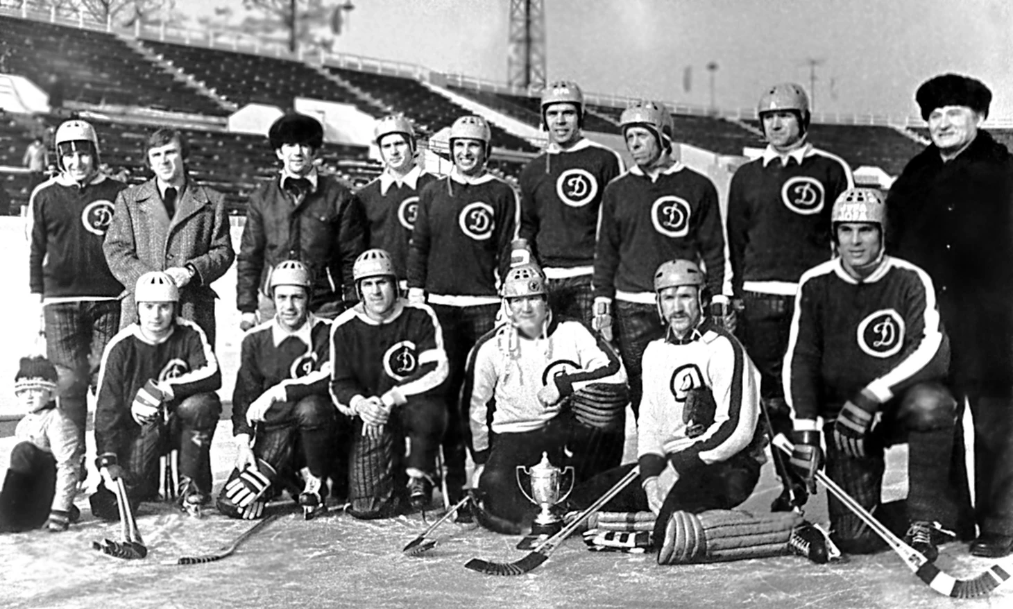 Сезон 1977/78 года. Алма-Ата. Стадион «Динамо». «Динамовцы Алма-Аты, одержав победу в двух матчах над финской командой «Оулун Луистинсеура», впервые стали обладателями Кубка европейских чемпионов по хоккею с мячом. Команда- победительница (нижний ряд, слева направо): Н. Шмик, Г. Любченко, А. Ионкин, В. Пахомов, М. Азизов, В. Горчаков, В. Алексеев; верхний ряд: врач команды Т. Павлюк, М. Быков, Л. Лобачев, Я. Апельганец, В. Бочков, Е. Агуреев, А. Осокин, старший тренер команды заслуженный тренер СССР и Казахской ССР А.Ф. Айрих, тренер команды заслуженный тренер СССР и Казахской ССР К.Д. Байбулов, В. Привалов, Б. Чехлыстов, В. Зайцев, Б. Третьяков (капитан команды)» (фото Д. Егизова из газеты «Советский спорт» № 41 за 18 февраля 1978 года)