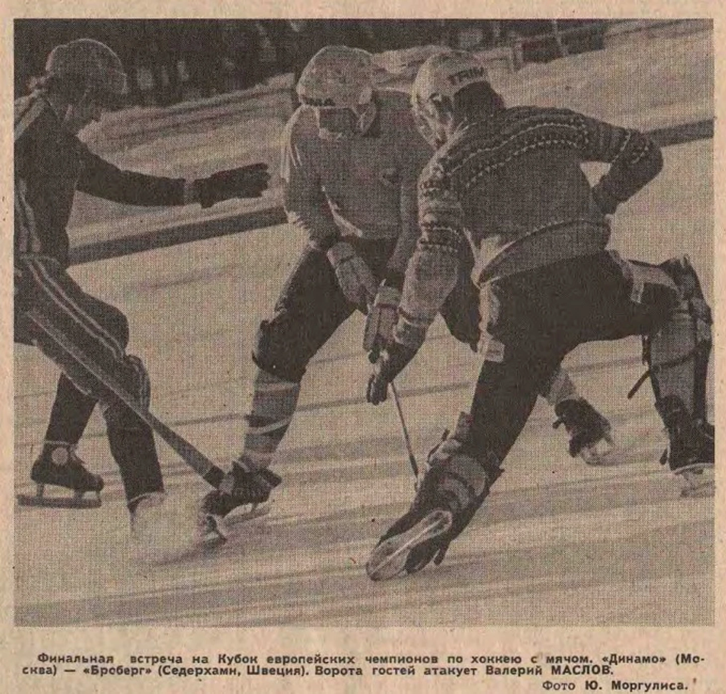14 декабря 1977 года. Москва. Стадион «Октябрь» (ул. Живописная, 21). Кубок европейских чемпионов 1976/77. Финал. Ответная игра. «Динамо» (Москва) - «Бруберг» (Сёдерхамн) - 6:5 (в дополнительное время). «Ворота гостей атакует Валерий Маслов» (фото Юрия Моргулиса из газеты «Советский спорт» № 291 за 15 декабря 1977 года)