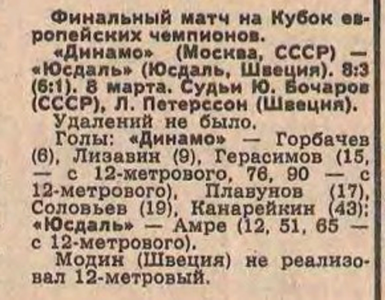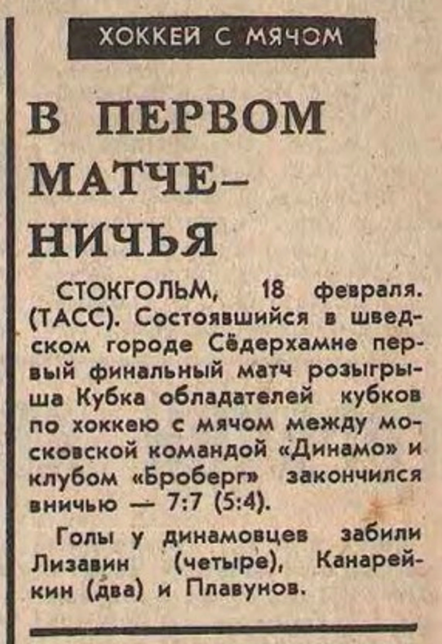 17 февраля 1977 года. Сёдерхамн. Кубок европейских чемпионов 1976/77. Финал. Первая игра. «Бруберг» (Сёдерхамн) - «Динамо» (Москва) - 7:7 (газета «Советский спорт» № 42 за 19 февраля 1977 года)