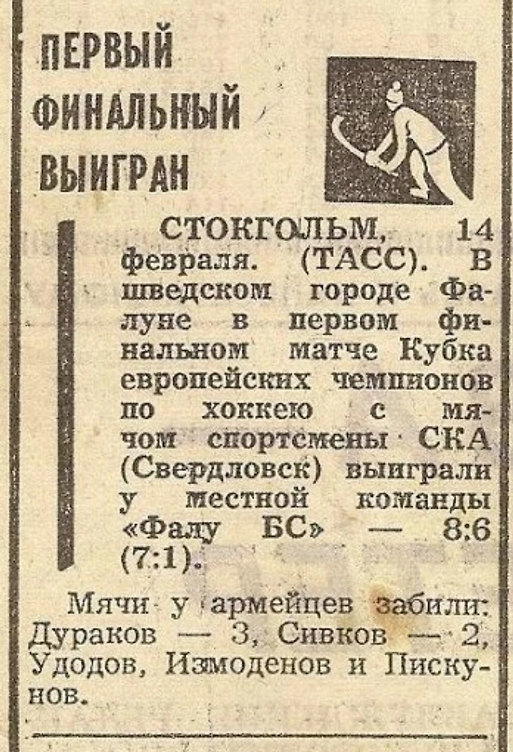 13 февраля 1975 года. Фалун. Кубок европейских чемпионов 1974/75. Финал. Первая игра. «Фалу» (Фалун) - СКА (Свердловск) - 6:8 (газета «Советский спорт» № 39 за 15 февраля 1975 года)