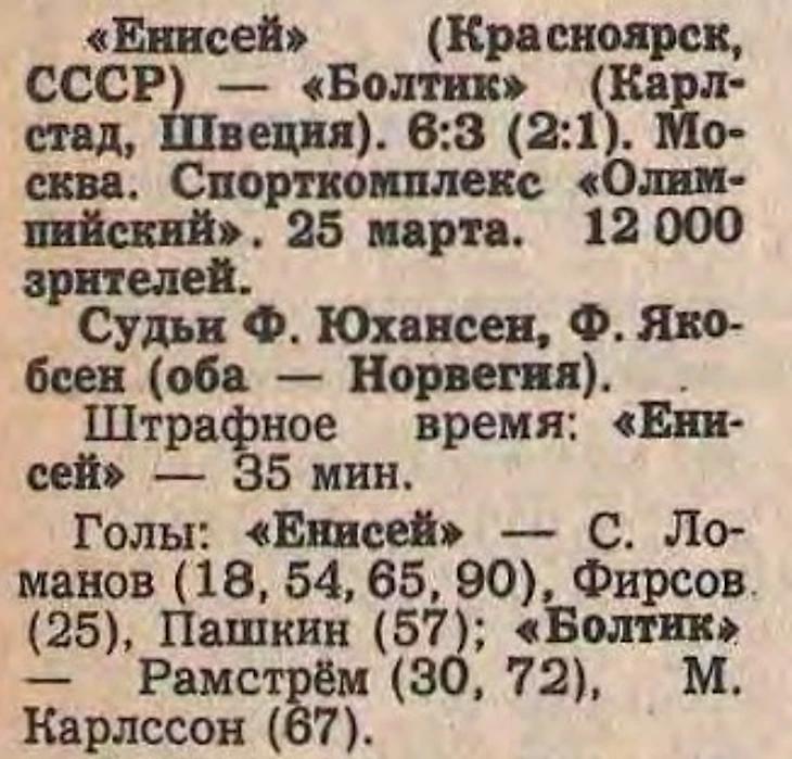 31 января 1984 года. Кемерово. Стадион «Химик». Кубок европейский чемпионов 1983/84. Финал. Ответная игра. «Енисей» (Красноярск) - «Болтик» (Карлстад) - 4:4 (0:3)