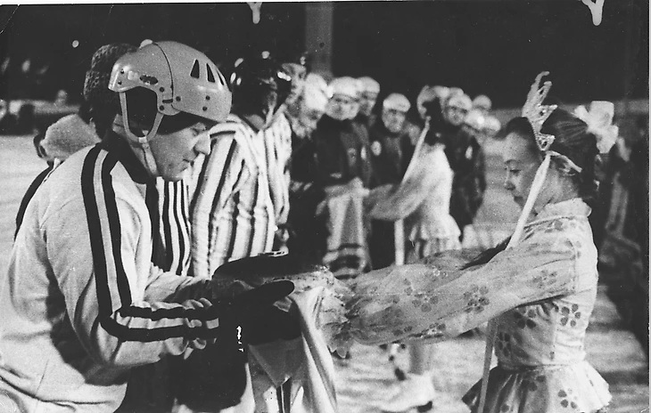 20 марта 1975 года. Свердловск. Центральный стадион. Кубок европейских чемпионов 1974/75. Финал. Ответная игра. СКА (Свердловск) - «Фалу» (Фалун) - 7:2 (2:1). Капитан армейцев Александр Измоденов на церемонии перед матчем (oblgazeta.ru)