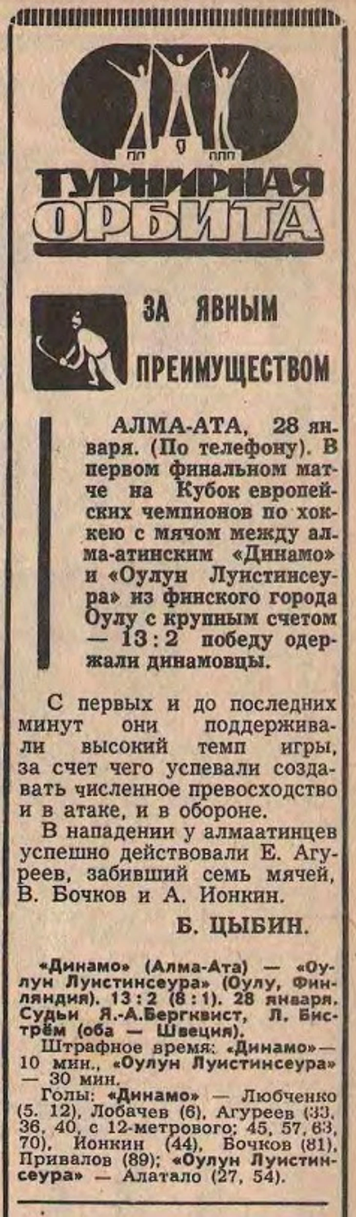 28 января 1978 года. Алма-Ата. Стадион «Динамо». Кубок европейских чемпионов 1977/78. Финал. Первая игра. «Динамо» (Алма-Ата) - «Оулун Луистинсеура» (Оулу) - 13:2 (газета «Советский спорт» № 24 за 29 января 1978 года)