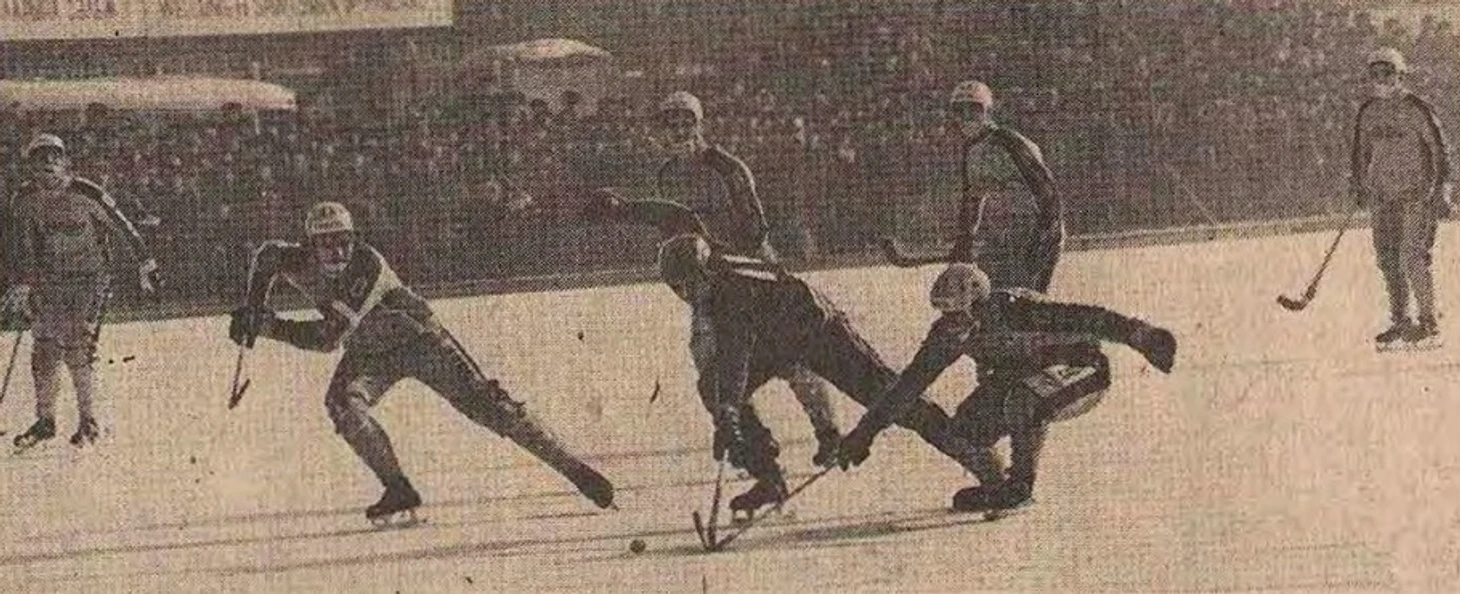 28 января 1978 года. Алма-Ата. Стадион «Динамо». Кубок европейских чемпионов 1977/78. Финал. Первая игра. «Динамо» (Алма-Ата) - ОЛС (Оулу) - 13:2 (8:1). «Динамо» в первом финальном матче на Кубок европейских чемпионов по хоккею с мячом нанесло крупное поражение финской команде «Оулун Луистинсеура». В этой игре отличился Е. Агуреев (№ 11), забивший семь мячей» (фото Д. Егизова из газеты «Советский спорт» № 25 за 31 января 1978 года)