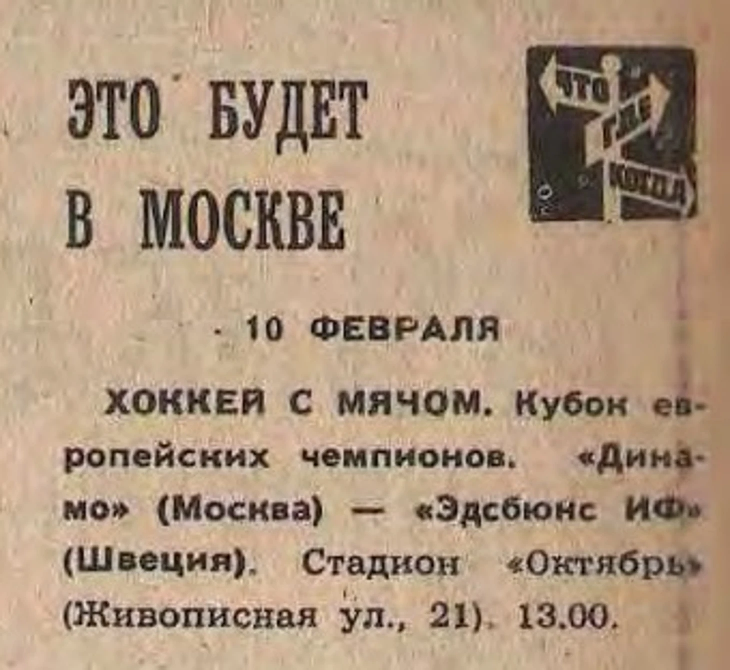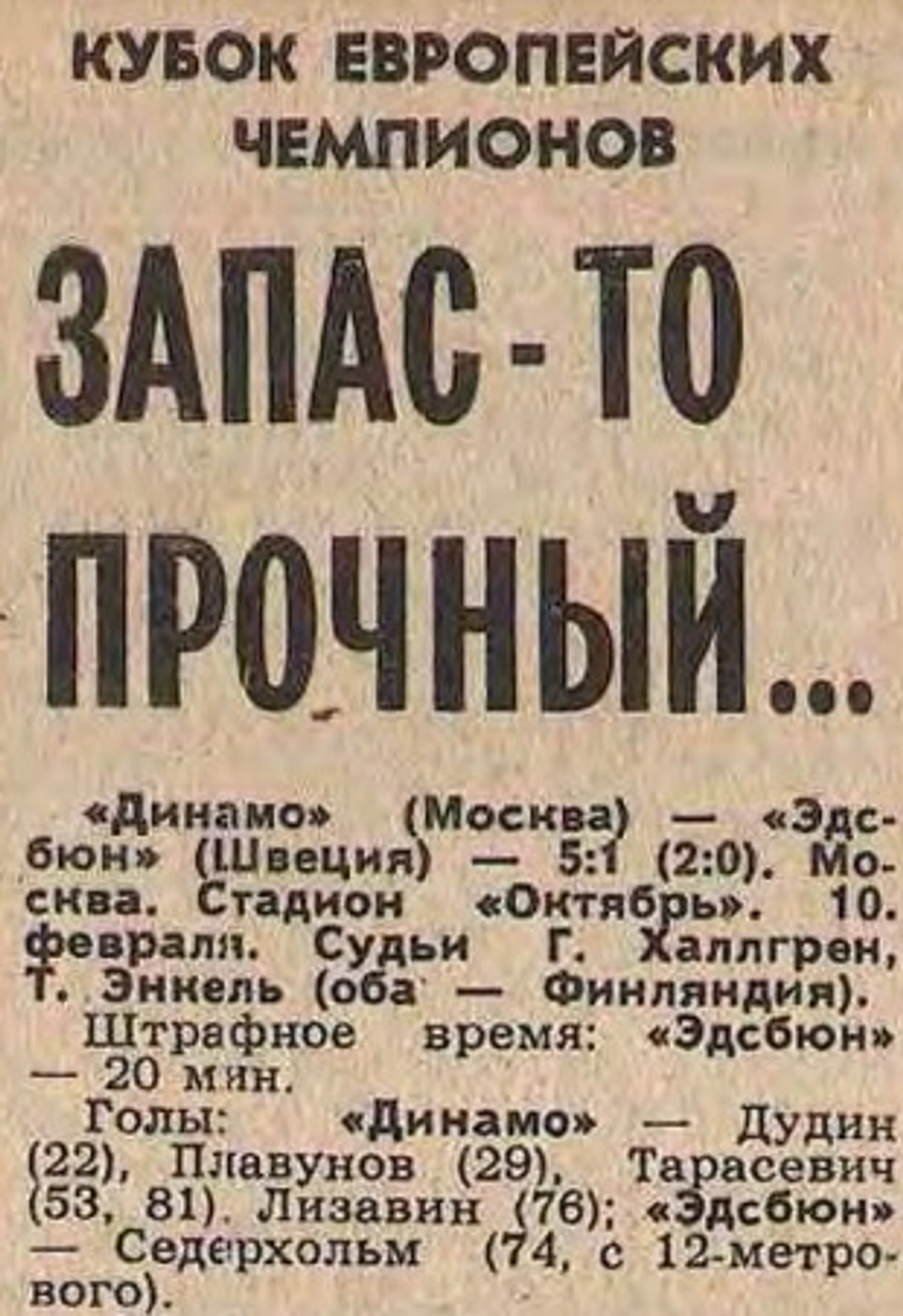 10 февраля 1979 года. Москва. Стадион «Октябрь» (ул. Живописная, 21). Кубок европейских чемпионов 1978/79. Финал. Первая игра. «Динамо» (Москва) - «Эдсбюн» (Эдсбюн) - 5:1 (газета «Советский спорт» № 35 за 11 февраля 1979 года)