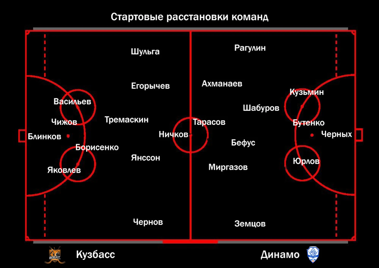 При стартовых раскладах не было больших сюрпризов. У Кузбасса был готов к старту чемпионата один из лидеров Руслан Тремаскин, пропустивший групповую стадию Кубка России из-за травмы. Молодому Кириллу Девятых главный тренер Кузбасса предпочел Алексея Ничкова. Со скамейки в течение матча усиляли игру Артем Репях и Дмитрий Макаров. У Динамо с начала сезона обойма не меняется, особенно атакующая группа. Единственного нападающего немного в оттяжке поддерживали Алмаз Миргазов и Егор Ахманаев.