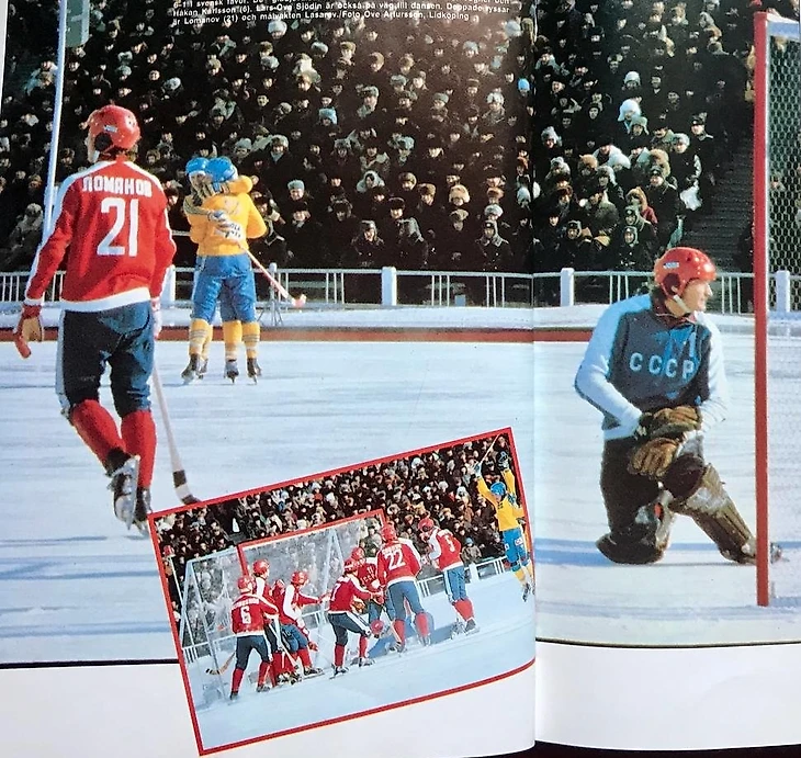 7 февраля 1981 года. Хабаровск. Центральный стадион имени В.И. Ленина. XII чемпионат мира. СССР - Швеция - 1:6 (0:5). Шведские полузащитники Пер Тугнер и Хокан Карлссон празднуют гол, на снимке рядом с ними Сергей Ломанов и вратарь Сергей Лазарев (фотограф Уве Артурссон)