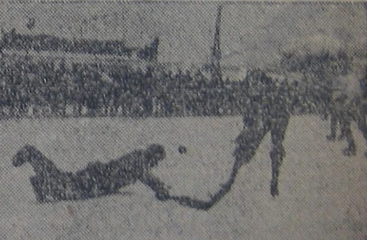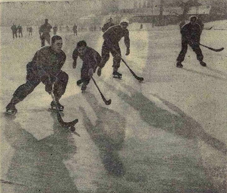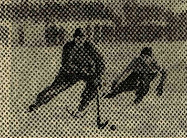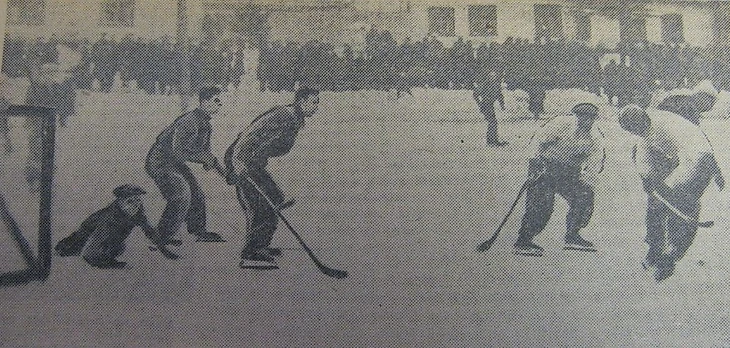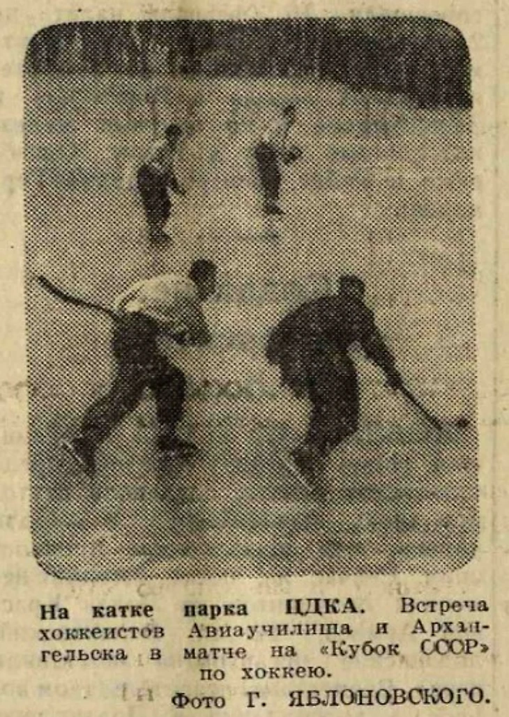 Февраль 1945 года. Каток парка ЦДКА. Кубок СССР. 1/8 финала. «Авиаучилище» (Москва) - сборная Архангельска - 3:1 (фото Г. Яблоновского из газеты «Вечерняя Москва» за 17 февраля 1945 года)