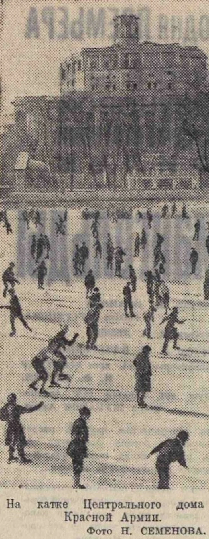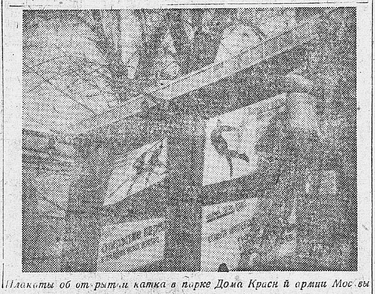 «Сегодня открывается каток ЦДКА. К услугам конькобежцев пять отдельных катков в парке Центрального Дома Красной армии (площадь Коммуны, 2). Для них приготовлено 30 тысяч квадратных метров льда. В парке будут два массовых катка, два хоккейных поля, беговая 400-метровая дорожка и каток для начинающих» (газета «Красный спорт» от 23 ноября 1936 года).