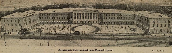 * - «В старом здании «вуза благородных девиц» разместился военный штаб культуры. На фронтоне, поддерживаемом десятью белоснежными колонами, новые люди выбили новые слова - четкое золото букв: «Центральный дом Красной армии и флота имени М. В. Фрунзе». <...> Собственно, это не Дом, даже и с большой буквы, а дворец, настоящий дворец: широкие мраморные лестницы, бронза, дуб, знамена, щиты, оружия, темно - красные коврики на блестящем паркете, сверкают медные ручки дверей, в прозрачных, как воздух, стеклах отражается золоченая музейная мебель, мраморные столы, старинные куранты, китайские урны, широкие мягкие диваны и кресла, облегающие стены. Огромное здание: сто пятнадцать комнат, 109 тысяч кубических метров, дышат уютом. <...> Сюда приходят не только военные и москвичи. Добрая половина падает на «штатских» - многие приезжают из провинции, иностранцев. <...> Музей Красной армии и флота, музей гражданской войны, Парижской коммуны, картинная зала, галерея. В них запечатлена в дереве, в бронзе, в фото, мраморе, на полотне, на выцветших листках прокламаций героика первых лет революции, память о партизанах, красногвардейцах, умиравших на баррикадах, в горячих песках Средней Азии, в сибирской тайге, в дальневосточных лесах, на берегу Тихого океана. Здесь в ЦДКА узнают, как вооружалась революция, и иностранные гости с изумлением рассматривают во «Дворце военной науки» деревянную самодельную «пушку - ружье», участницу славных побед. <...> В Доме есть многое, что следует посмотреть, многое, чему следует поучиться. Одиннадцать кабинетов-лабораторий (боевой подготовки, вооружения, политработы иностранных армий, ветеринарный, морской, воздушного флота, снабжения, санитарный, массовой военной пропаганды среди населения, текущей военной хроники - мозг вооруженных сил пролетариата - гордость ЦДКА. <...> В них комсостав совершенствуется в военных знаниях, повышает квалификацию, готовится в Военную академию, начсостав запаса получает переподготовку, и скоро низовые ячейки Осоавиахима обогатятся свежими кадрами руководителей и инструкторов. <...> Краснознаменный колонный зал на 1 200 человек, красноармейский зал - аудитория на 600 - изо дня в день здесь читаются лекции, доклады, проходят концерты, диспуты, кино, конференции. Широкая лестница ведет на хоры краснознаменного зала, сжатые двадцатью четырьмя блестящими, снежными колоннами. Прямо с хор вы попадаете на третий этаж. Справа и слева идут комнаты отдыха, широкие лампы под светло-синим шелком абажуров льют спокойный свет на ядовитые поля бильярдов, с сухим треском пересекают зеленые просторы шары из слоновой кости; напряженно - тихи комнаты шахмат, более шумно в каютах пинг-понга; из тира с усовершенствованными электрифицированными мишенями глухо доносятся выстрелы. <...> Книгохранилище, библиотека, большой читальный зал, малый... здесь уже тишина доведена до совершенства. Тяжелая мебель подбита резиной. Ни разговоров, ни стука, только легкий шелест книг и журналов. <...> Библиотека (30 000 томов) пополняется с каждым днем, в нее текут реки книг, на - днях из Военного штаба в библиотеку ЦДКА вливается 200 000 томов. Красноармеец, командир получают в Доме крепкую культурную зарядку, чтобы с новыми силами приняться за работу. ЦДКА учит как работать и как отдыхать». (И. Сергеев «Штаб военной культуры»; литературно-художественный и 