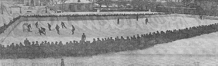 В тридцатые годы прошлого века большинство из нескольких десятков московских катков, на которых проводились игры на первенство и кубок столицы по хоккею, а их было более пятидесяти, не имели вместительных трибун, а на многих их вообще не было (спорт тогда был больше действием чем зрелищем). К таким относились и ледовые поля в парке на площади Коммуны (ранее Екатерининская), на которых тренировались и играли армейские хоккеисты МВО и ЦДКА. Армейские спортсмены появились в этом старом парке из-за того, что в день девятой годовщины Красной армии, 23 февраля 1927 года, Моссовет - высший орган власти в столице - постановил выделить для организации Центрального дома Красной армии и флота имени М.В. Фрунзе одно из лучших зданий города тех лет, расположенное на Екатерининской площади (ранее в нем размещался Центральный дом коммунистического воспитания рабочей молодежи/ЦДКВРМ, а до революции - Екатерининский институт благородных девиц). Переоборудование здания и парка для нужд ЦДКА началось в мае 1927 года под руководством военного инженера Н.М. Никифорова, а уже 23 февраля 1928* года состоялось его торжественное открытие.