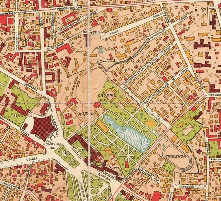 1937 год. Фрагмент плана Москвы (retromap.ru). Парк ЦДКА (в виде подковы - теннисный стадион; справа внизу - стадион «Буревестник» (ранее «Унион», имени Профинтерна, ССТС, СКиГ и «Бувестник»)