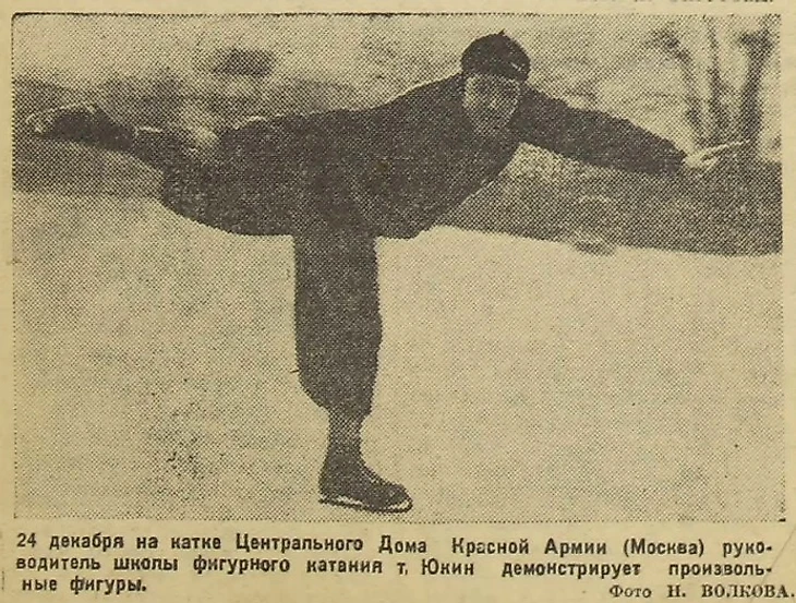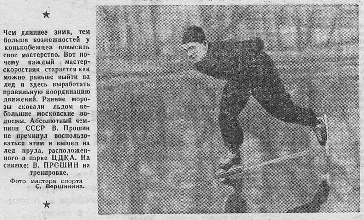 Середина ноября 1949 года. Парк ЦДКА. Тренировка на пруду абсолютного чемпиона СССР 1949 года по конькам Владимира Прошина (фото С. Вершинина из газеты «Советский спорт» за 17 ноября 1949 года)