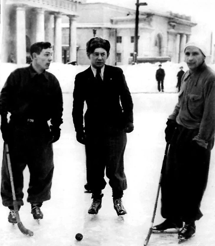 Зима 1939/40 годов. Парк ЦДКА. Хоккей. ЦДКА - «Буревестник» (Москва). Ведущий форвард армейцев Николай Бабич (слева), судья матча Иван Широков (в центре) и Виктор Листиков из «Буревестника» на фоне теннисного стадиона - массового театра (фото из энциклопедии «Хоккей с мячом»; составители В.И. Соснин, М.И. Щеглов, В.Л. Юрин; Москва, 2009)