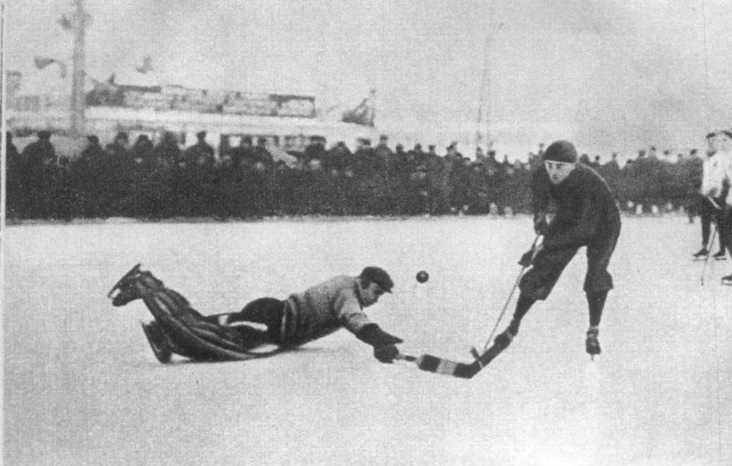 28 февраля 1932 года. Каток ЦДКА. Сборная Москвы - сборная Германии - 6:0. Москвичи в атаке на ворота Ганса Эрфурта (souo-mos.ru)