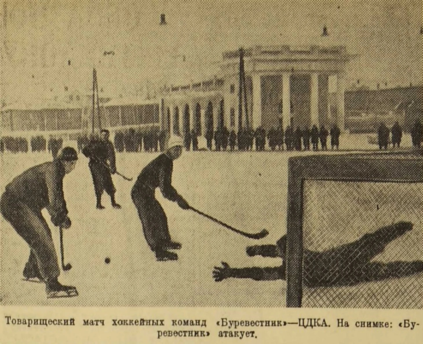 28 ноября 1948 года. Парк ЦДКА. Товарищеский матч. ЦДКА - «Крылья Советов» - 0:2. «Первый хоккейный матч в Москве. Играют команды ЦДКД - «Крылья Советов». <...> Чемпионы вышли без Боброва, Бабича и Никонорова. <...> На снимке: общий вид хоккейного поля в парке ЦДКА во время матча» (фото И. Волкова из газеты «Советский спорт» за 30 ноября 1948 года)