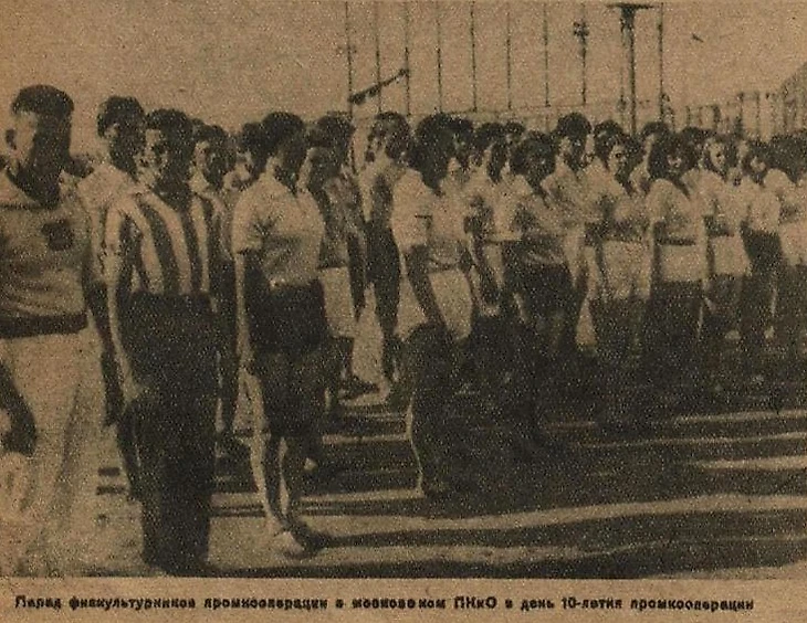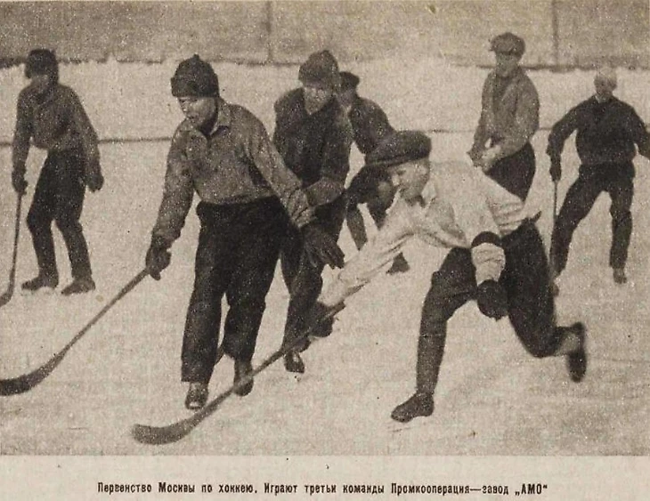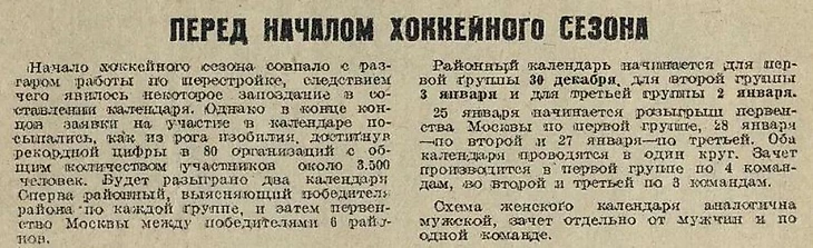 «Зима не заставила долго ждать. Еще 9 ноября играли в футбол, а уже 27-го большинство московских хоккеистов резали коньками свежий сверкающий лед. В предстоящем календаре, разыгрываемом в одни круг (раз в шестидневку), заявлено от 68 коллективов по 8 группам 5 000 мужчин и 600 женщин. В распоряжении этой массы хоккеистов 38 хоккейных полей. В спортивном отношении календарь будет представлять большой интерес, так как коллективы в группах подобраны приблизительно равной силы. В I группу вошли «Динамо», «Серп и молот», СКИГ, «Москопромсовет», «Электрозавод», «Трехгорная», завод № 24 и «Гознак»; II группа - «Дукат», ЦДКА, МОГЭС, з-д им. Сталина (б. АМО), «Красная Роза», з-д «Динамо», Казанская ж. д. и «Каучук». О силах коллективов пока судить трудно, так как первые игры показали большое желание играть, но вместе с тем, и слабую технику (стыки, плохой ход на коньках, отсутствие тактики). Печальные итоги футбольного сезона в отношении грубости и недисциплинированности на полях должны заставить коллегию судей и ДК [дисциплинарную комиссию] быть во всеоружии. Первые товарищеские игры состоялись в ясный морозный день 30 ноября, «Промкооперация» легко обыграла «Гознак» <...>, добившись в первых [командах] счета 6:1. <...> 6 декабря день был замечательный: солнце и небольшой мороз. <...> «Оригинальная» встреча произошла на стадионе «Красные Сокольники». «Промкооперация», обыграв младшими командами б-цу им. Остроумова (III гр.), вышла первой командой в составе 8 человек, в рубашках всех цветов радуги и все же выиграла 4:2. <...> 12 декабря на стадионе «1 мая» «Промкооперация» всеми командами обыграла «Электрозавод» [у первых счет 3:0]» (журнал «Физкультура и спорт» № 1 за январь 1932 года).